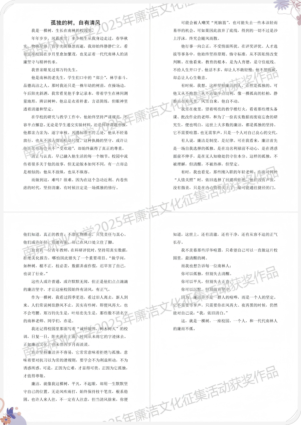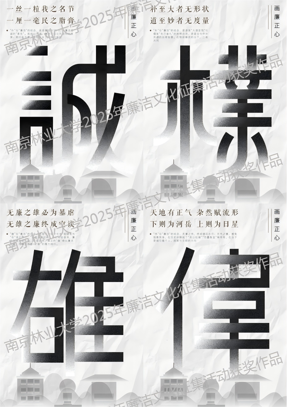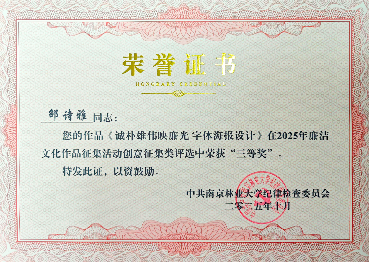 本次活动中,我院共选送13幅作品,其中纪开智同学的作品《孤独的树,自有清风》荣获“一等奖”;邹诗雅与曾佳祺同学合作创作的《诚朴雄伟映廉光 字体海报设计》、徐立博同学的作品《清杉雪松铸廉廊》荣获 “三等奖”。